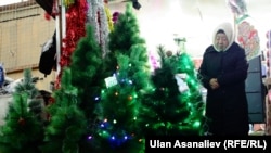 Далее мы отправились на рынок, чтобы узнать цены на искусственные ели. Продавщица на Аламединском рынке Гульмира продает китайские елки высотой до 2 метров. Цены на них от 300 сомов за 60 сантиметров до 2 тысяч 700 сомов за двухметровую пластиковую ель. В день она продает свыше 10 елок, почти столько же, сколько и продавцы настоящих лесных красавиц.