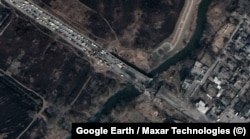 Брошенные машины, воронки от разорвавшихся артиллерийских снарядов. Так мост через Ирпень выглядел на спутниковых снимках, сделанных 31 марта 2022 года, в последний день российской оккупации Киевской области.